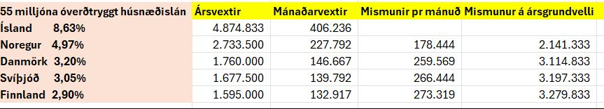 „Á Íslandi eru meðaltals óverðtryggðir vextir 8,63 prósent, á meðan þeir eru 4,97 prósent í Noregi, 3,20 prósent í Danmörku, 3,05 prósent í Svíþjóð og 2,90 prósent í Finnlandi. Ef við horfum á 55 milljóna óverðtryggt húsnæðislán þá er myndin skýr: á Íslandi greiðir heimilið 4.874.833 krónur í ársvexti en í Finnlandi aðeins 1.595.000 krónur. Munurinn er 3,28 milljónir króna á ári, eða rúmar 273 þúsund krónur á mánuði. Það er fé sem gæti farið í lífsgæði og öryggi heimilanna, en fer í staðinn beint í vasa bankanna.