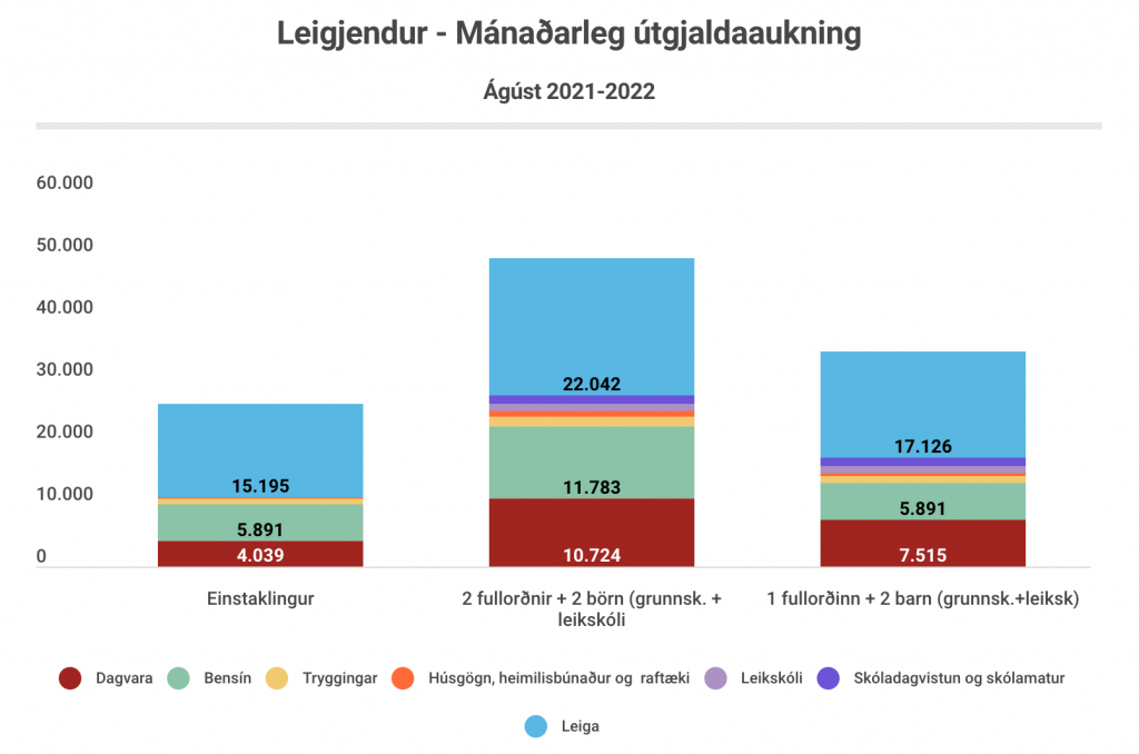 Ef við skoðum hvernig verðhækkanir síðasta árs getur birst í útgjöldum þeirra sem eru á leigumarkaði má sjá að mánaðarleg útgjöld fjölskyldu sem samanstendur af tveimur fullorðnum og tveimur börnum sem leigir 120 fm íbúð í Reykjavík hafa hækkað um 49.458 kr. á einu ári. Á sama tímabili hafa mánaðarleg útgjöld einstæðs foreldris með tvö börn sem leigir 80 fm íbúð í Reykjavík hækkað um 34.593 kr. Þá greiðir einstaklingur sem leigir stúdíóíbúð í Reykjavík 26.165 kr. meira í helstu kostnaðarliði í dag en fyrir ári síðan. Hækkun á leigu miðast við leiguvísitölu sem mælir verðþróun á nýjum leigusamningum og endurspegla tölurnar meðalhækkun á tilteknum leiguíbúðum í Reykjavík. Dæmin byggja á áætluðum meðalútgjöldum og verðþróun úr vísitölu neysluverðs. Neðst í fréttinni má lesa um forsendur fyrir útreikningunum.