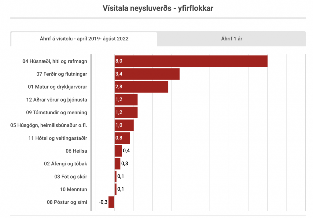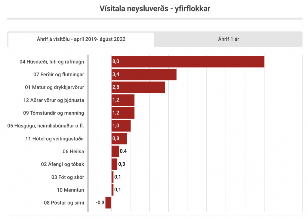 Þannig hefur verð á húsnæði, hita og rafmagni hækkað um 15,8% á einu ári, verð mat- og drykkjarvöru hækkað um 8,6%, verð á ferðum og flutningum um 14,9%, verð á hótelum og veitingastöðum um 8,4% og verð á húsgögnum og heimilisbúnaði um 3,6%. Verðhækkanirnar eru meiri frá apríl 2019 en minni munur er á verðhækkunum eftir flokkum á því tímabili. Verð á húsgögnum og heimilisbúnaði hefur t.d. hækkað um 16% á því tímabili samanborið við 18% hækkun á mat- og drykkjarvöru.