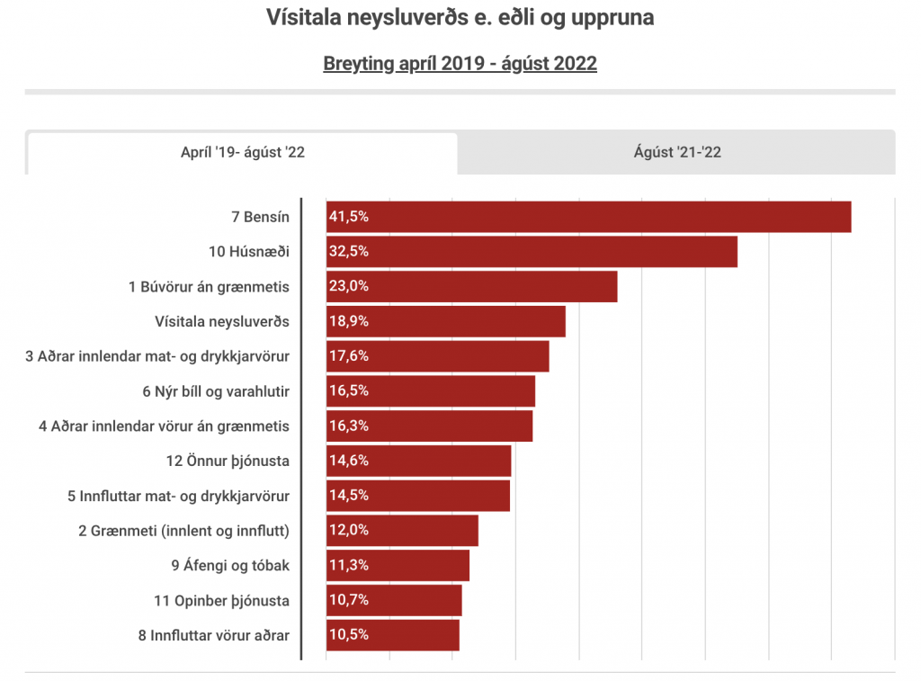 Frá undirritun lífskjarasamninga (apríl 2019) hefur verð á bensíni hefur hækkað mest (41,5%) en þar á eftir kemur húsnæði ( 32,5%), búvara (23%) og önnur innlend mat- og drykkjarvara (17,6%). Innlend vara (matvara og önnur innlend vara) hefur hækkað meira en innflutt vara bæði ef horft er aftur til undirritun Lífskjarasamninga og eitt ár aftur í tímann. Þá hefur verð á opinberri þjónustu hækkað töluvert á árinu (ágúst 2021-2022) eða 5,7% en um 10,5% sé horft aftur til apríl 2019.