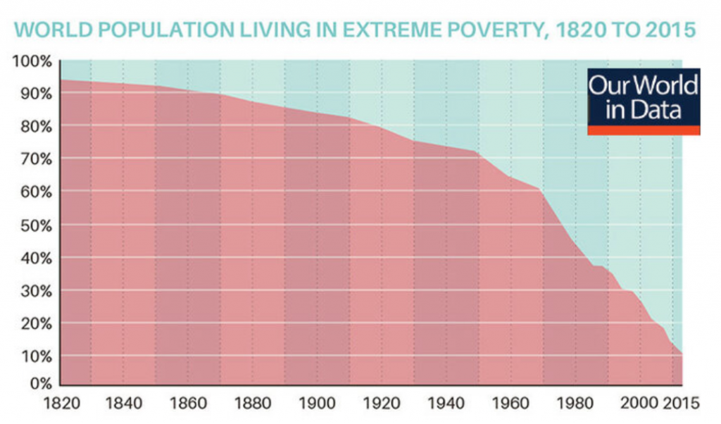 Þetta línurit segir að árið 1820 hafi 90% af öllu mannkyninu búið við sárafátækt, en árið 2015 hafi sú tala verið komin niður í 10%. Pinker birti einnig sambærilegt línurit í sinni bók og notaðist við svipaðar tölur. Þeir aðilar sem sem halda þessum tölum fram vilja auðvitað meina að þetta sé allt saman kapítalisma að þakka.
