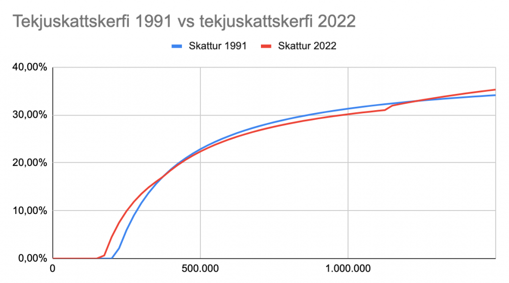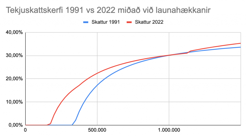 Ef borið er saman tekjuskattskerfið 1991 og 2022 kemur í ljós að skattbyrði lægstu tekna hefur aukist sé miðað við fast verðlag. Og þegar gert er ráð fyrir hækkun launa afhjúpast að skattabreytingar nýfrjálshyggjuáranna stórjók skattbyrði fólks á lægstu launum og lágum meðallaunum.