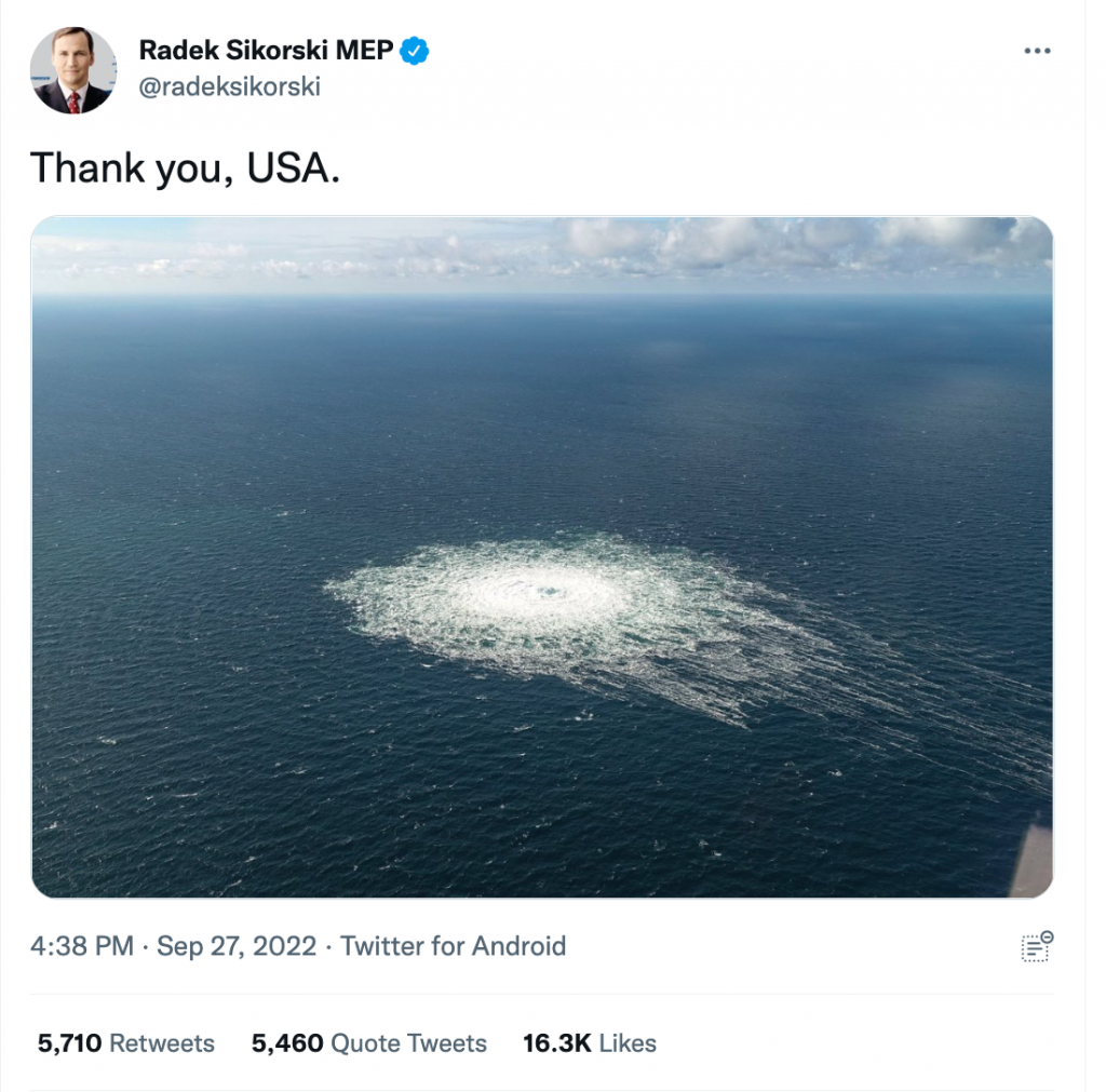 Þýsk yfirvöld og Evrópskir embættismenn hafa hafið rannsókn á málinu en ekkert liggur fyrir enn um hver beri ábyrgð á árásinni. Í dag hafa skrif fyrrum utanríkisráðherra Póllands, Radek Sikorski, vakið athygli þar sem hann virðist þakka Bandaríkjunum fyrir skemmdarverkin. Radek er þingmaður á Evrópuþinginu og eiginmaður blaðakonunnar og sagnfræðingsins Anne Applebaum sem þekkt er fyrir að styðja stríðsrekstur Bandaríkjanna.