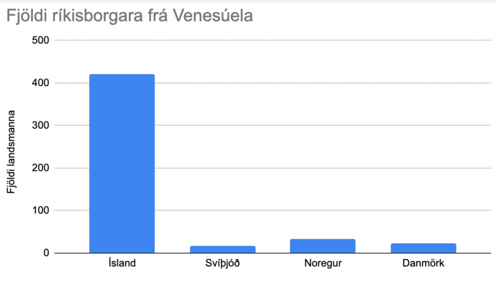 En þessi sérstaka stefna íslenska stjórnvalda gagnvart Venesúela sést líka hjá þjóðskrá hér heima og á Norðurlöndum. Hér eru nú 715 ríkisborgarar Venesúela, sem er meira en í Svíþjóð (505), Noregi (486) eða Danmörku (370). Ekkert hinna landanna virðust skilgreina ástandið í Venesúela sem sama forgangs-neyðarástandið og íslensk stjórnvöld.