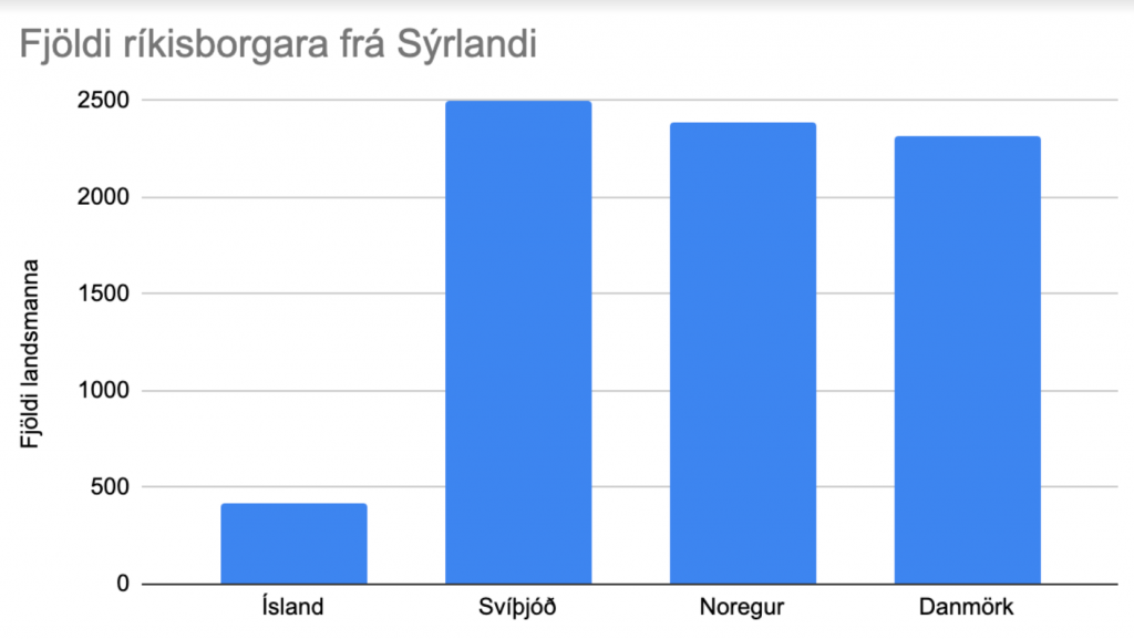Og hér er samskonar graf um ríkisborgara frá Sýrlandi. Íslenska súlan sýnir fjölda fólks með sýrlenskt ríkisfang á Íslandi en hinar súlurnar hversu margir Sýrlendingar væru á Íslandi ef fjöldinn væri hlutfallslega sá sami og í hinum löndunum.