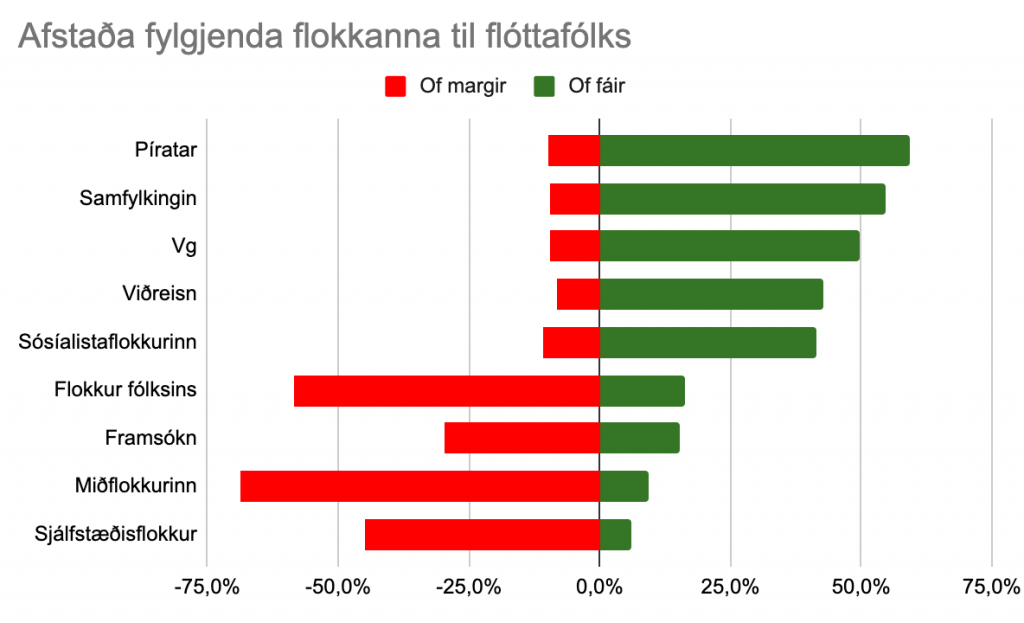 Þarna skiptast flokkarnir í tvö horn. Stuðningsfólk Pírata, Samfylkingar, Vg, Viðreisnar og Sósíalistaflokks telja flóttafólk hér of fátt en síður of margt. Þessu eru öfugt farið hjá Framsókn, Flokki fólksins, Miðflokknum og Sjálfstæðisflokknum. Þar eru mun fleiri sem segja flóttafólk og margt en þau sem segja það of fátt.