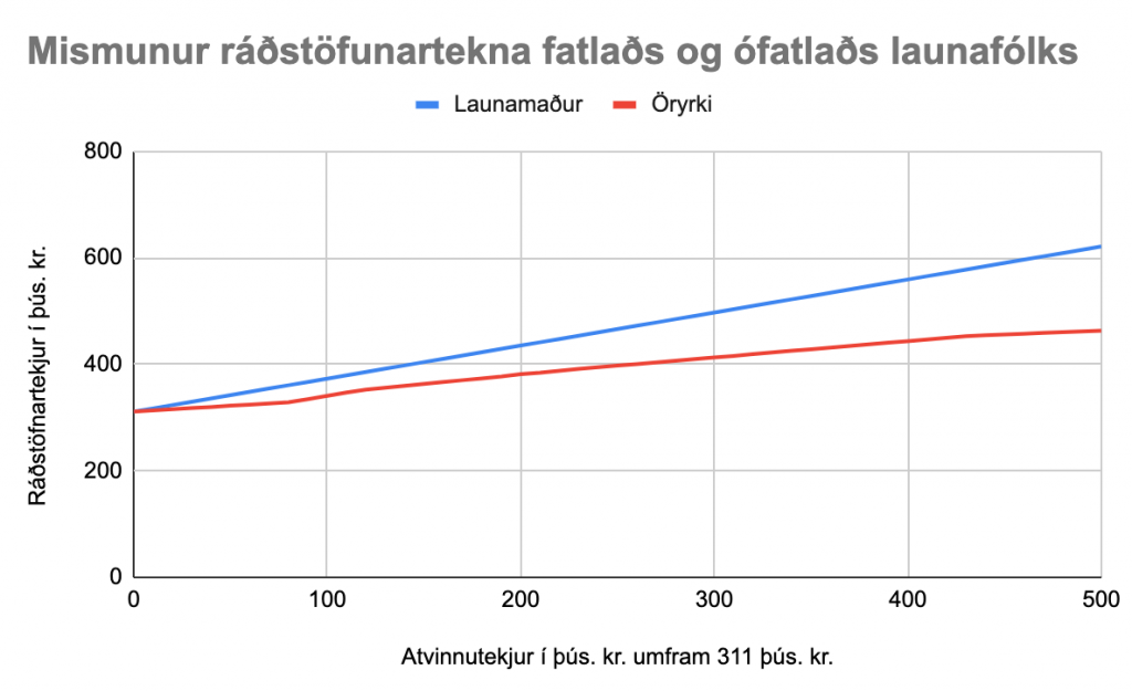 Munurinn helst nokkuð stöðugur að 120 þús. kr. bilinu en bilið fer fljótlega eftir það að breikka. Af 200 þús. kr. í aukatekjur sér hann aðeins rúmar 70 þús. kr. í launaumslaginu á meðan ófatlaður launmaður fær 124 þús. kr. eða langleiðina í tvöfalt hærri upphæð.