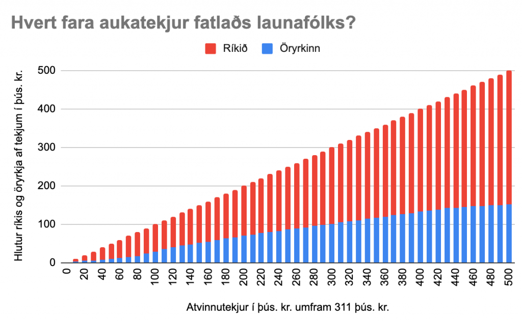Þegar aukatekjur öryrkja eru orðnar 70 þús. kr. er hann aðeins að sjá um 15 þús. kfr. af þeirri upphæð en ófatlaði launamaðurinn 43 þús. kr. eða nær þrisvar sinnum meira.