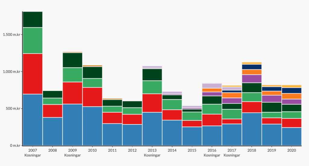 Þó má sjá að síðari árin, 2019-20 eru framlögin minni. Það má vera vegna þess að ekkert var kosið þessi ár, en líka vegna þess að styrkirnir hækkuðu. Það er athygli vert að einstaklingar leggja nánast ekkert til Pírata og Flokks fólksins. Þeir flokkar lifa af opinberum styrkjum fyrst og fremst.