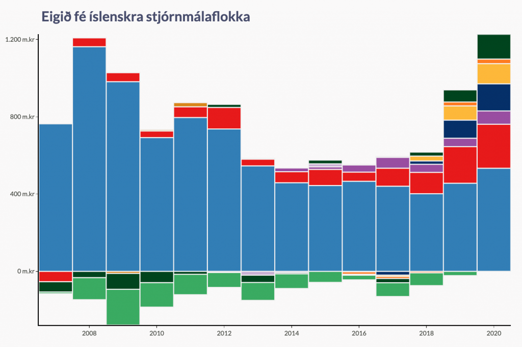 Þarna sést að síðasta árið eru allir flokkar komnir upp fyrir núllið. Árin eftir Hrun skulduðu Framsókn og Vg meira en flokkarnir áttu. Það er svo athygli vert að sjá sterka fjárhagsstöðu nýju flokkanna Flokks fólksins og Miðflokksins og hvað fjárhagsstaða Samfylkingar og Vg hefur styrkst mikið.