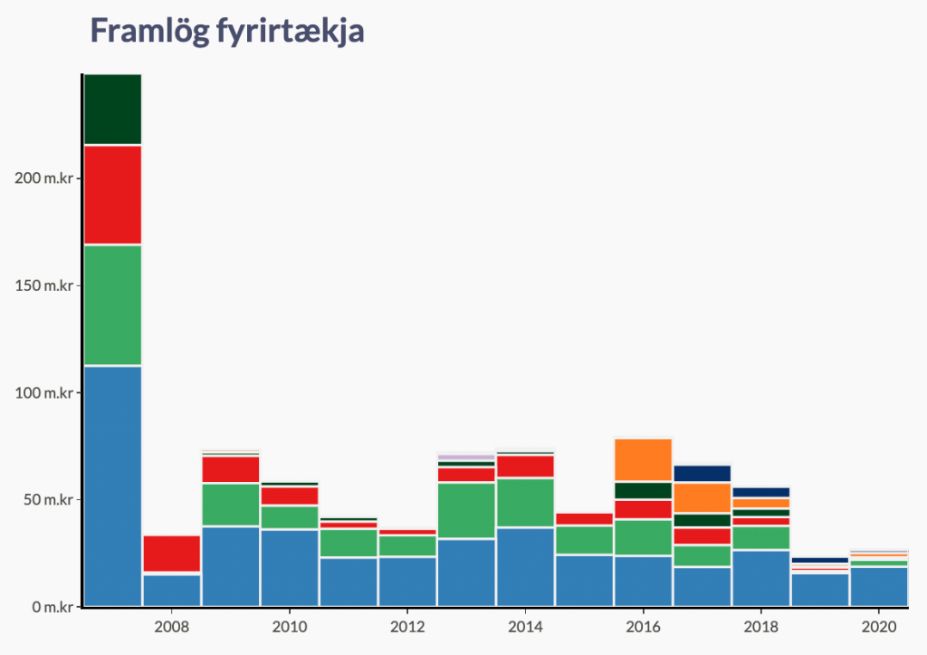 Þarna sést að framlög frá fyrirtækjum nánast hurfu við Hrunið nema hvað þau voru áfram nokkur hjá Sjálfstæðisflokki og Framsókn, en mun minni hjá öðrum.