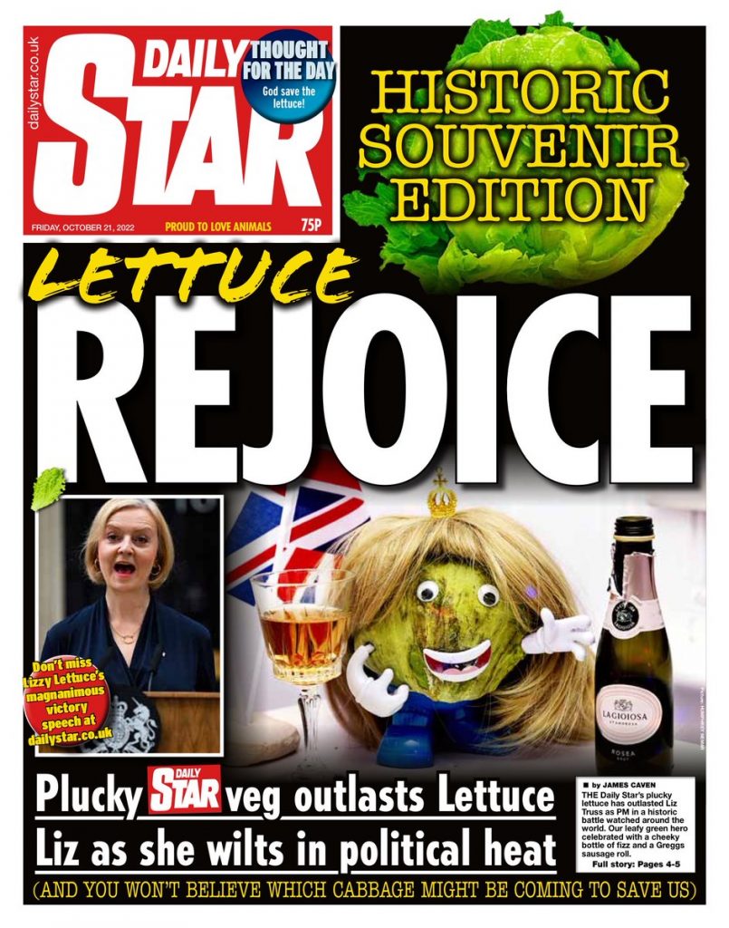 Breska blaðið Star setti íssalat-haus á forsíðuna fyrir viku og sagði hann myndi lifa lengur en Liz Truss í embætti. Fólk gat síðan fylgst með þessum salathaus á netinu með tikkandi klukku við hliðina. Og þegar Truss sagði af sér í hádeginu var salatið enn ekki farið að rotna. Salatið vann.