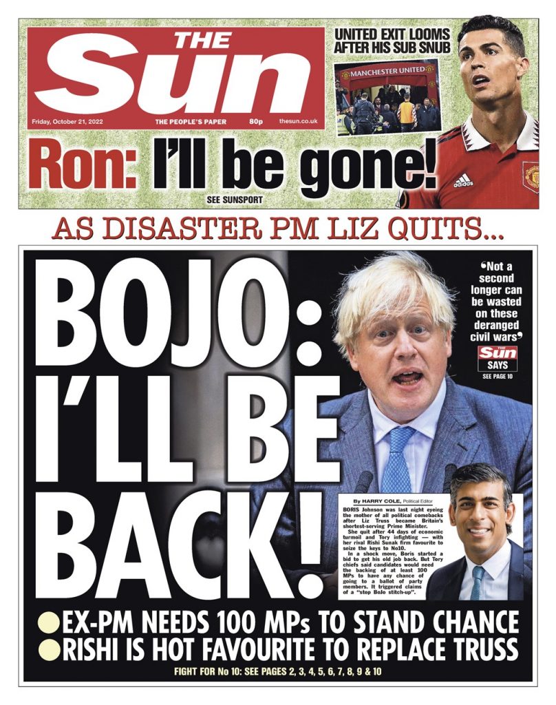 The Sun veltir upp möguleikanum á að Boris Johnson snúi aftur, en til að komast í leiðtogavalið þurfa frambjóðendur að tryggja sér stuðning 100 þingmanna af 356 þingmönnum Íhaldsflokka. The Sun segir Rishi Sunak líklegastan til að verða fyrir valinu.