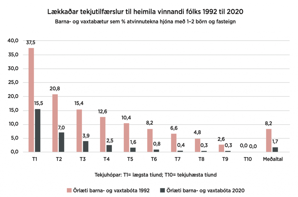 Örlæti barna- og vaxtabóta er sýnt sem hlutfall atvinnutekna fjölskyldna í tíu jafn stórum tekjuhópum, frá þeim lægstu (T1) til þeirra tekjuhæstu (T10). Ljósu súlurnar eru fyrir árið 1992 en þær svörtu árið 2020.