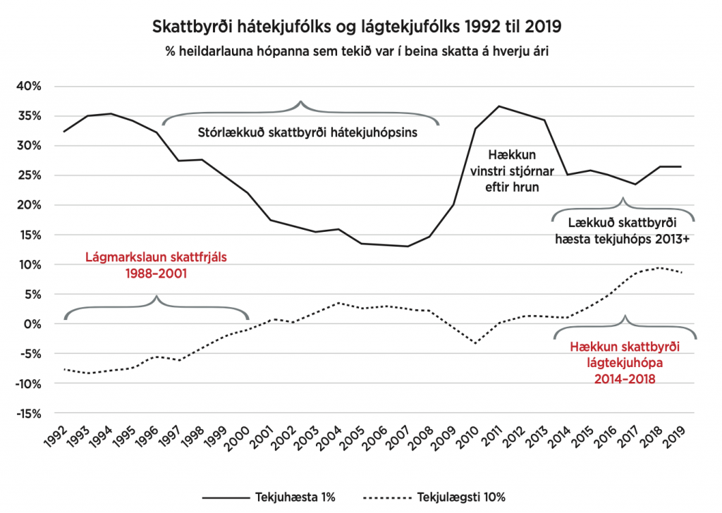 Frá byrjun tíunda áratugarins hefur byrði tekjuskattsins verið færð af hátekjufólki og yfir á lægri tekjuhópa, mest yfir á þá tekjulægstu. Á mynd 1 er þetta sýnt fyrir tekjuhæsta eina prósentið og tekjulægstu tíu prósentin, ár frá ári á tímabilinu 1992 til 2019. Þessi þróun var sérstaklega afgerandi á árunum frá 1994 til 2005.