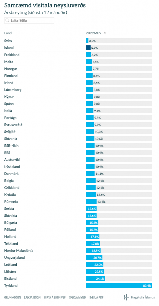 Hagstofan birti samræmda vísitölu neysluverðs og raðast Evrópulöndin svona upp: