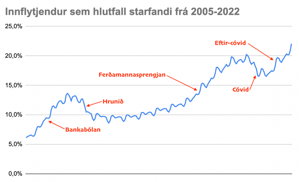 Hlutfall innflytjenda á vinnumarkaði hefur vaxið hratt á eftir cóvid, eins og sjá má á þessu grafi: