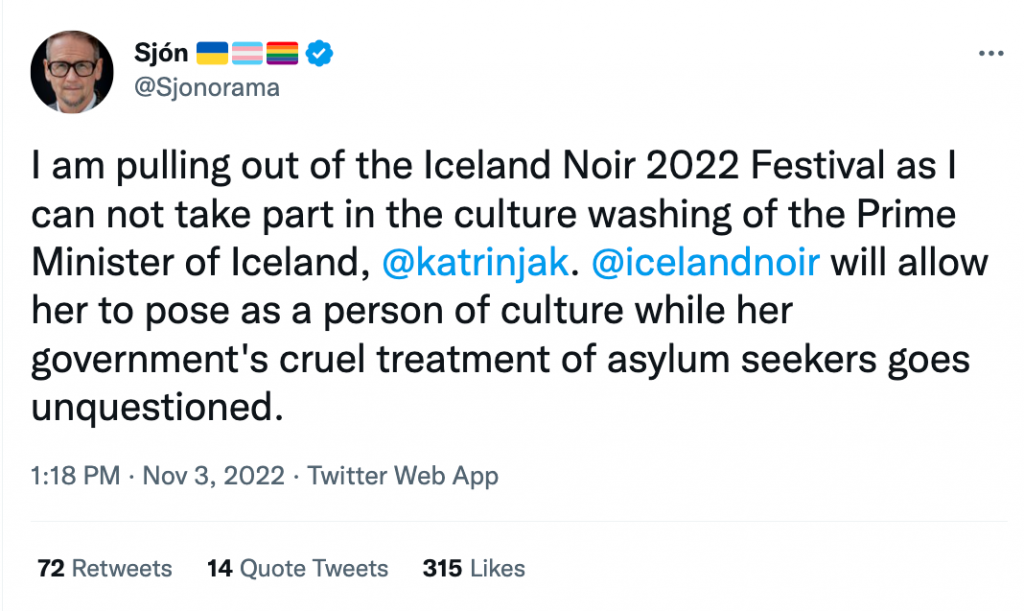 Engin andmæli við þessum aðgerðum hafa heyrst frá forystufólki Framsóknar og Vg. Þögn Katrínar Jakobsdóttir kallaði á viðbrögð Sjón, sem hætti við að mæta á glæpasagnaráðstefnu, vildi ekki deila sviðsljósi með Katrínu sem lætur ofbeldið gagnvart flóttafólkinu óátalið.