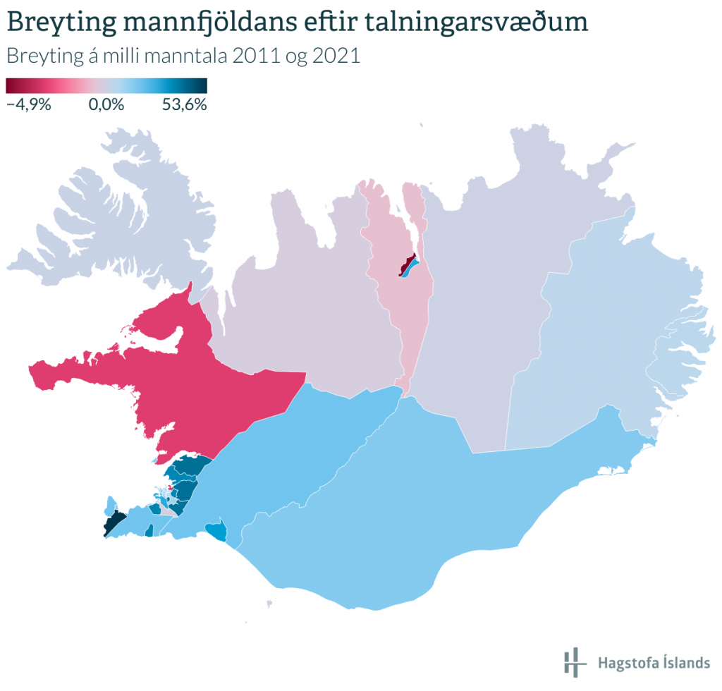 Síðast var gert manntal árið 2011. Hlutfallsleg breyting á þessum tíu árum var þessi, skipt eftir talningarsvæðum manntalsins: