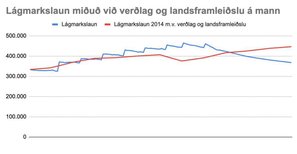 En laun eiga að hækka meira en verðlag vegna þess að landsframleiðsla á mann hækkar að jafnaði meira en verðlag. Þess vegna er önnur lína á grafinu sem sýnir lágmarkslaunin frá 2014 á föstu verðlagi en auk þess að teknu tilliti til hækkunar landsframleiðslunnar. Fram til dagsins í dag er miðað við landsframleiðslu á mann, en spá um landsframleiðslu almennt til ársloka 2025 í hagspá Landsbankans. Sú spá fól ekki í sér mannfjöldaspá.