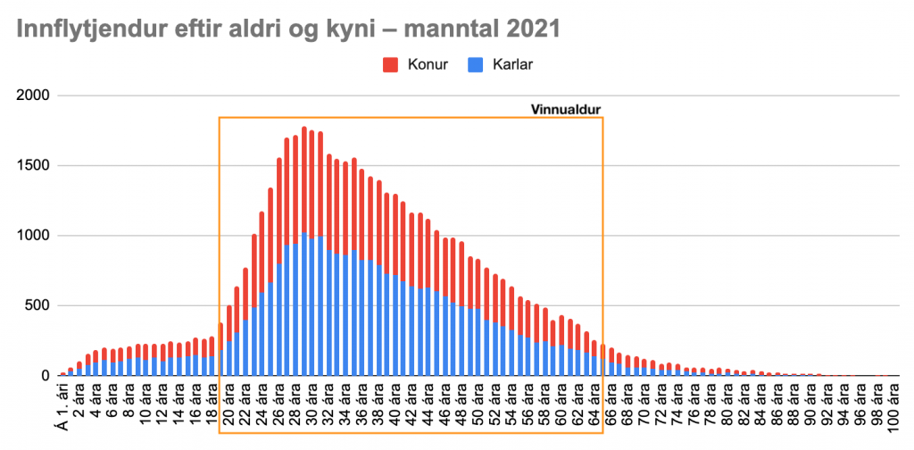 Hér má sá aldursskiptingu innflytjenda í manntalinu frá 2021: