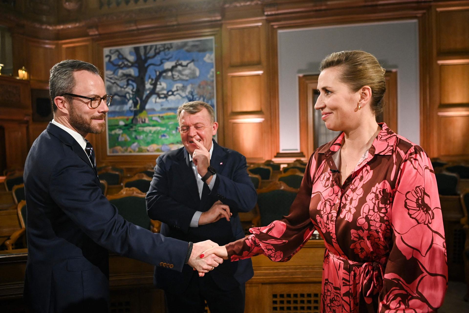 Myndin er af Mette Frederiksen að heilsa Jakob Ellemann-Jensen. Lars Løkke Rasmussen fylgist sposkur með.