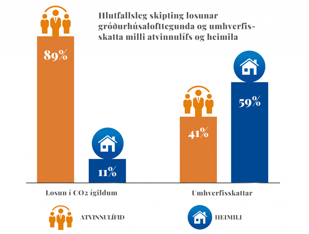 Í nýbirtum gögnum Hagstofu Íslands kemur fram að heimili greiða meirihluta umhverfisskatta á Íslandi eða 59%, sem er eitt hæsta hlutfall í Evrópu. Alls greiddu heimilin um 32 milljarða króna í umhverfisskatta árið 2020 en atvinnulífið og erlendir aðilar um 22 milljarða. Þetta er í engu samræmi við losun gróðurhúsalofttegunda því atvinnulífið á Íslandi ber ábyrgð á tæpum 90% losunar og heimilin 11%. Svo virðist sem stjórnvöldum þyki sjálfsagt mál að heimilin á Íslandi séu látin axla ábyrgðina á skattgreiðslum til að stemma stigu við losun. Frá árinu 2012 hafa hins vegar þau sem kaupa rafmagnsbíla og tengiltvinnbíla notið skattaívilnana vegna kaupa á nýjum rafmagns- og tengiltvinnbílum svo hluti rennur aftur til heimilanna. BSRB hefur bent á að það séu frekar tekjuhærri heimili sem kaupi slíka bíla og að kolefnisgjöld og önnur gjöld af jarðefnaeldsneyti leggist hlutfallslega þyngst á tekjulægstu heimilin. Því má segja að tekjulægri heimili á Íslandi hafi niðurgreitt kaup tekjuhærri heimila á grænorkubifreiðum undanfarin 10 ár og axlað ábyrgð á hluta losunar atvinnulífsins.