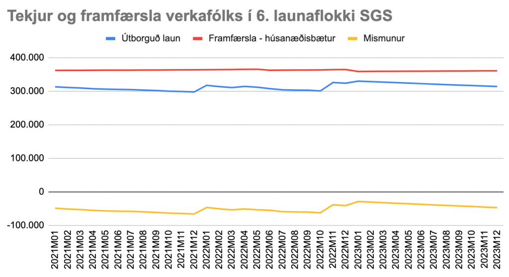Frá janúar 2021 til desember 2023 hækkuðu launin um tæplega 77.990 kr. Skattar og iðgjöld hækkuðu um 18.338 kr. svo ráðstöfunartekjurnar hækkuðu aðeins um 59.652 kr. Yfir tímann hækkaði framfærslan að frádregnum húsnæðisbótum um 66.901 króna svo staða fulvinnandi verkafólks á þessum launum versnaði um 7.249 kr. í nafnkrónum talið.