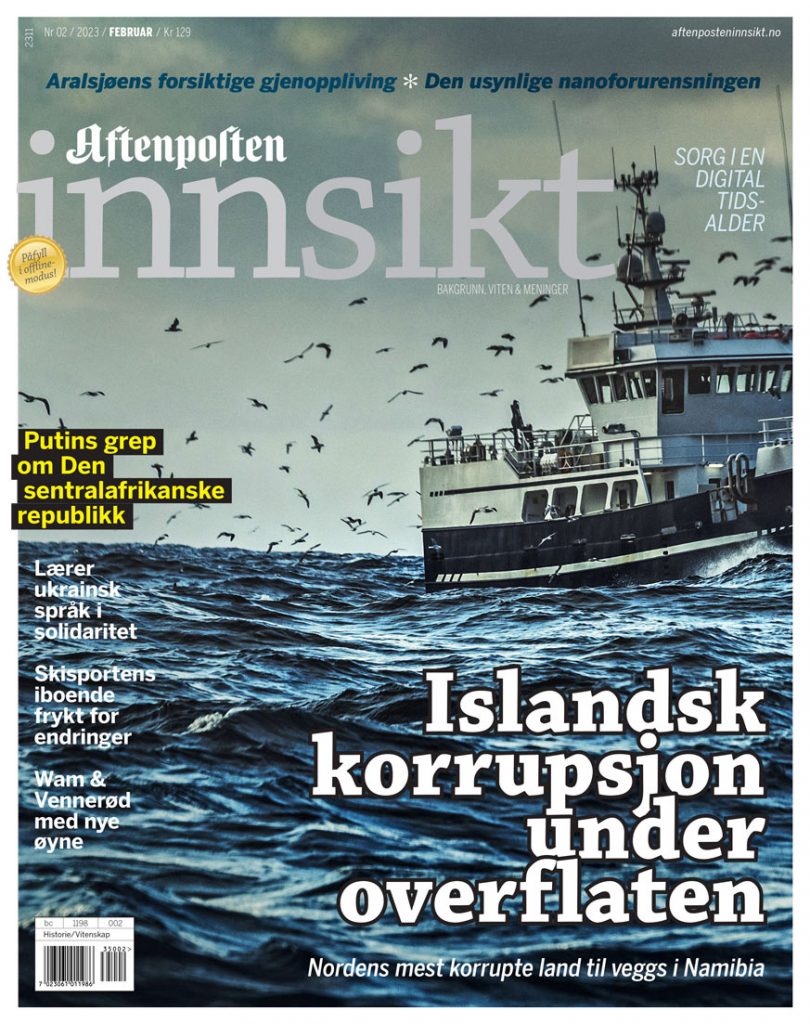 Samherjamálið er á forsíðu mánaðarritsins Innsikt sem fylgir stórblaðinu Aftenposten í Osló. Þar stendur á forsíðu: Íslensk spilling undir yfirborðinu – spilltasta Norðurlandið upp við vegg í Namibíu.