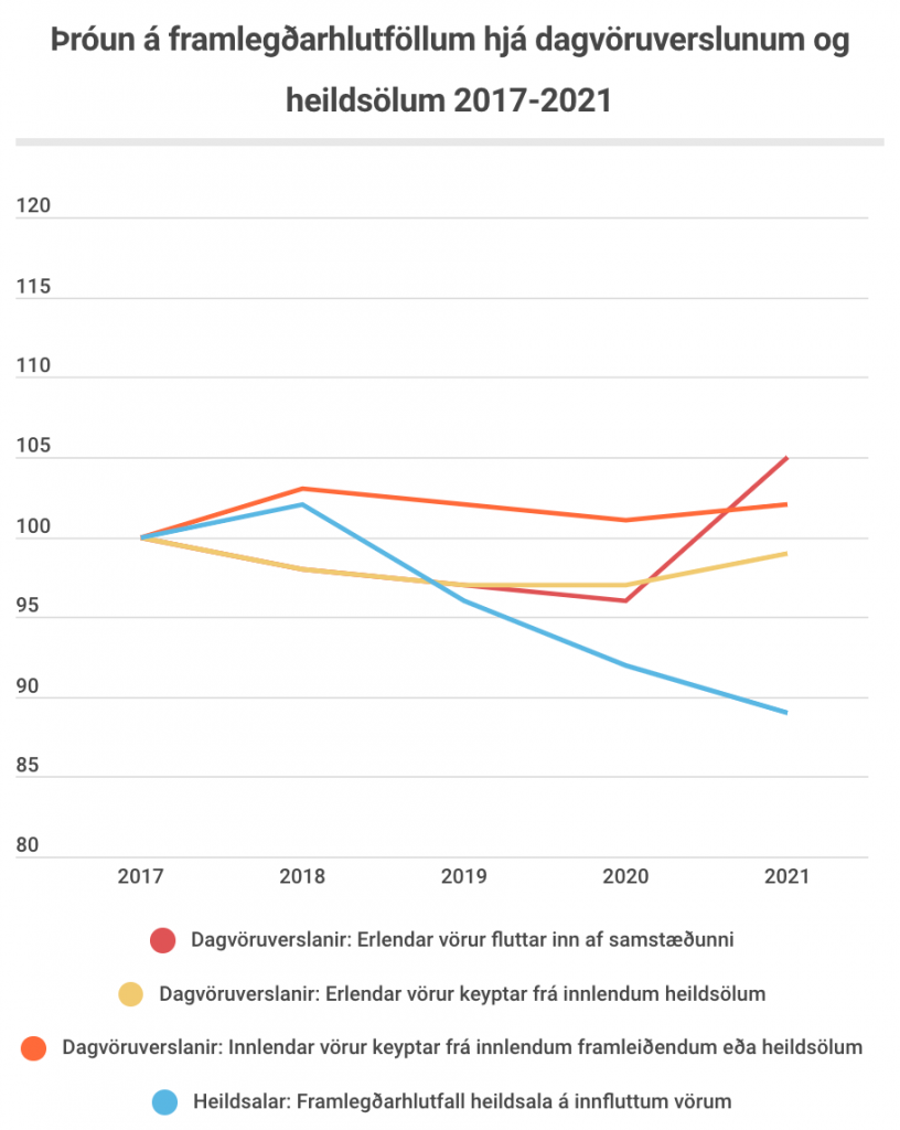 Framlegðarhlutfall heildsala vegna sölu á innfluttri vöru til dagvöruverslana lækkaði og var 3,9 prósentustigum lægra árið 2021 en 2018. Á sama tímabili hækkaði framlegðarhlutfall dagvöruverslana af innfluttum vörum keyptum af heildsölum lítillega eða um 0,2%.