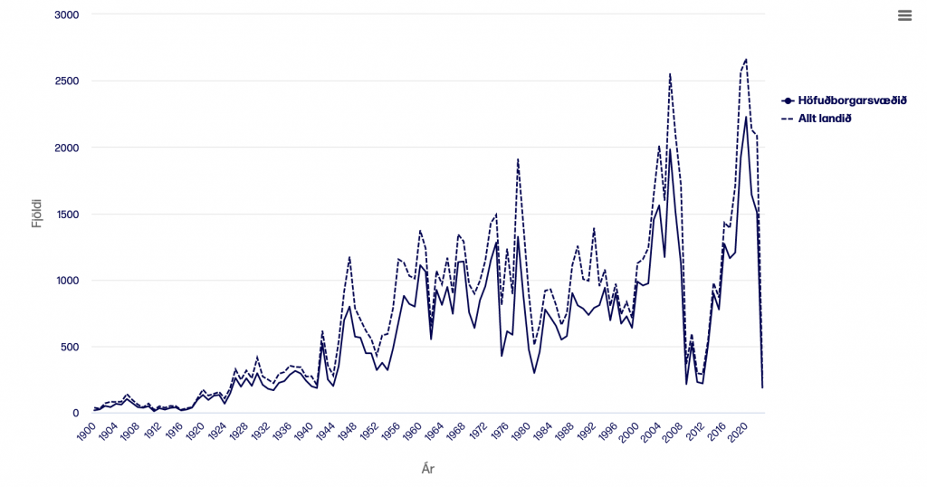 Fjöldi íbúða eftir byggingarári: Yfirlit yfir fjölda íbúða í Fasteignaskrá eftir skráðu byggingarári.