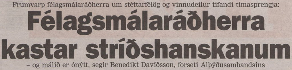 Í Morgunblaðinu lýsti Benedikt svikunum. Hann sagði ráðherra hafa slitið viðræðum sem voru í gangi milli aðila vinnumarkaðarins um samskiptareglur á vinnumarkaði.