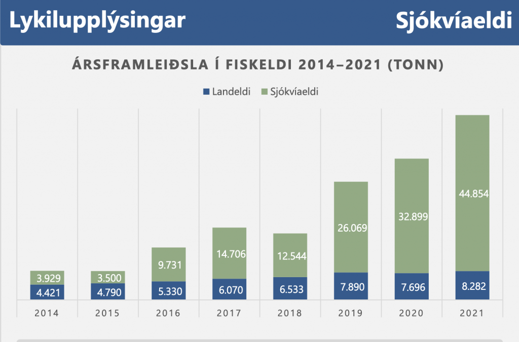 Sjókvíaeldi við Ísland meira en tífaldaðist á tímabilinu 2014‒2021. Ársframleiðsla