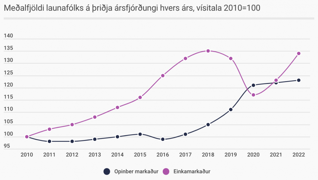Sé eingöngu litið til fjölda launafólks 2010-2022 jókst fjöldi þeirra sem starfa á opinberum markaði um 23% á árunum 2010-2022 en um 34% á almennum markaði. Aukning í fjölda launafólks á opinberum markaði var nær engin á tímabilinu 2010-2017 en á sama tíma jókst fjöldi launafólks á almennum markaði um rúmlega 30%. Frá 2017-2021 jókst fjöldinn vissulega mun hraðar á opinbera markaðnum en á hinum almenna en áhrif heimsfaraldurs skekkja myndina verulega. Þessi skekkja leiðréttist að mestu á árinu 2022 þegar kröftugur viðsnúningur varð í hlutfallslegri fjölgun milli almenns og opinbers markaðar. Einhverra hluta vegna er ekki er fjallað um þetta í skýrslu Intellecon.