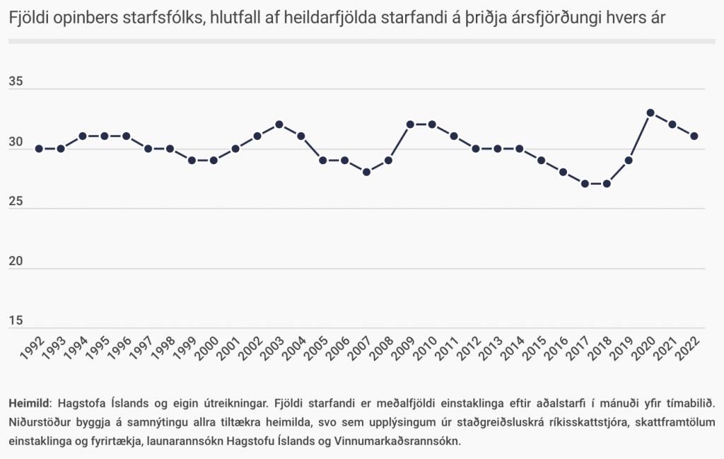 Nei, ekkert bendir til þess. Opinbert starfsfólk er nú 31% af heildarfjölda starfandi fólks á Íslandi sem er í takt við langtímameðaltalið og það sem vænta má miðað við stöðu hagsveiflunnar. Hlutfallið hefur rokkað frá 27-33% síðustu þrjá áratugi og minnkar í uppsveiflu en eykst í niðursveiflu.
