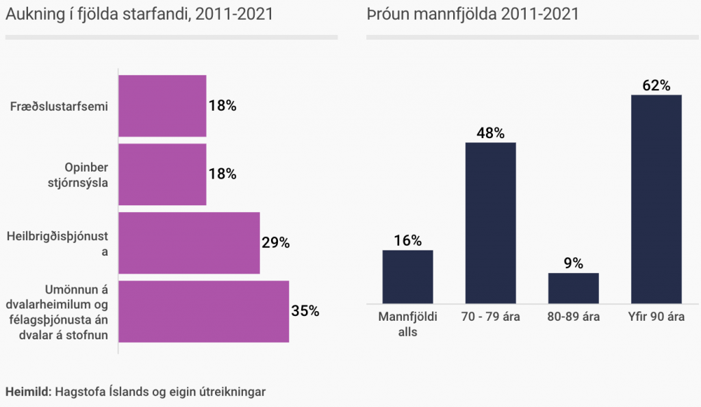 Það fer eftir því hvernig horft er á málið. Á árunum 2011-2021 jókst fjöldi starfandi í fræðslustarfsemi og opinberri stjórnsýslu nokkurn veginn í takt í íbúafjölgun. Skortur hefur hins vegar myndast í heilbrigðisþjónustu og umönnunargreinum en fjöldi starfandi starfandi í heilbrigðisþjónustu jókst um 29% á tímabilinu og um 35% í umönnunargreinum. Á sama tíma hefur fjöldi íbúa á aldrinum 70-79 ára aukist um nær helming og fjöldi íbúa yfir 90 ára um rúmlega 60%. Fjöldi erlendra ferðamanna hefur einnig margfaldast á tímabilinu með tilheyrandi álagi á heilbrigðisþjónustu. Sterkar vísbendingar eru um að umönnunarkrísa sé í uppsiglingu á Íslandi en hingað til hefur henni verið afstýrt með yfirvinnu og auknu álagi á starfsfólk í vaktavinnu.