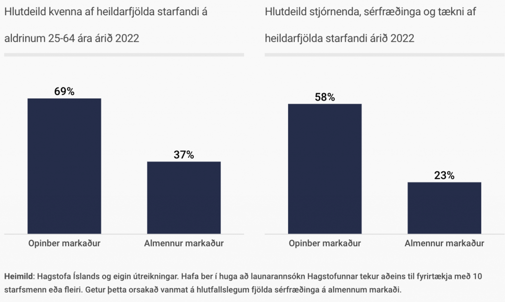 Markaðirnir eru nokkuð frábrugðnir í eðli sínu. Tæplega 70% starfandi á opinberum markaði eru konur en 37% á almenna markaðnum skv. launarannsókn Hagstofunnar. Tæplega 60% starfandi á opinberum markaði eru með háskólamenntun eða aðra sérhæfða menntun að baki en aðeins 23% á almennum markaði. Opinberi markaðurinn er því kvenlægur og með hátt menntunarstig. Nauðsynlegt er að hafa þennan eðlismun í huga við allan samanburð á kjörum milli markaða.