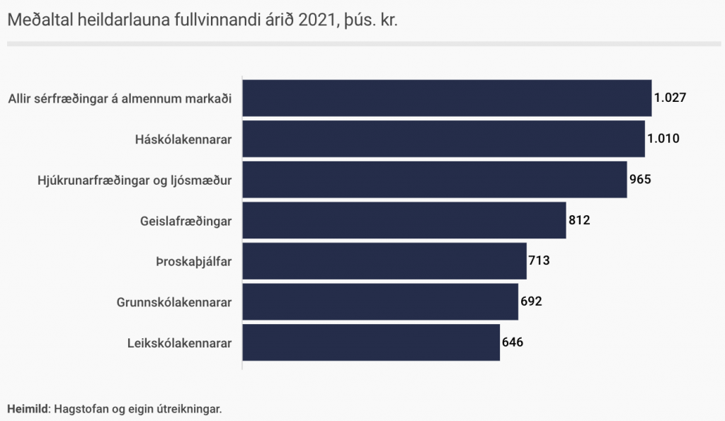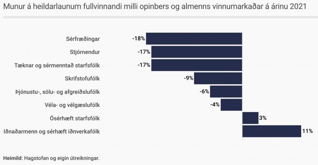 Heilt yfir er launamunur hverfandi milli markaða ef horft til meðaltals í heildarlaunum fullvinnandi fólks árið 2021. Hér ber hins vegar að hafa í huga að markaðirnir eru með engu móti sambærilegir, til dæmis þegar kemur að menntunarstigi, og því er slíkur samanburður meðaltals ómarktækur. Meðaltal heildarlauna fullvinnandi er lægra fyrir alla starfsflokka á opinberum markaði en almennum nema í tilfelli ósérhæfðs starfsfólks og iðnaðarmanna. Mestur er munurinn hjá sérfræðingum en meðaltalið er þar tæplega 20% lægra á opinberum markaði. Lægst launuðustu sérfræðingar landsins starfa hjá sveitarfélögunum.