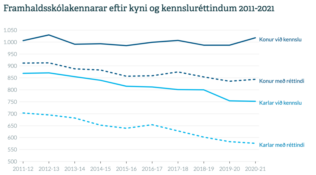 Framhaldsskólakennurum með kennsluréttindi fækkar hægt og örugglega. Frá 2012 til 2021 fækkaði þeim úr 1641 í 1445 manns eða um 12%. Körlum fækkar hraðar, um 18% á sama tíma og konum fækkar um 7%.