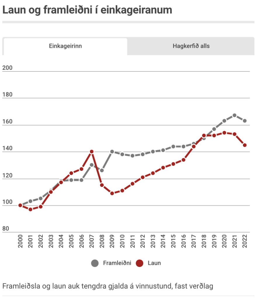 Launasumman í hagkerfinu nemur tæplega tvö þúsund milljörðum. Þar af eru tæplega fjórtán hundruð milljarðar í einkageira. Alls jukust laun um 17% milli ára að nafnvirði í einkageira en einungis um 4,1% að raunvirði. Sé tekið tillit til fjölgunar vinnustunda drógust raunlaun á vinnustund saman um 4,9% milli ára.