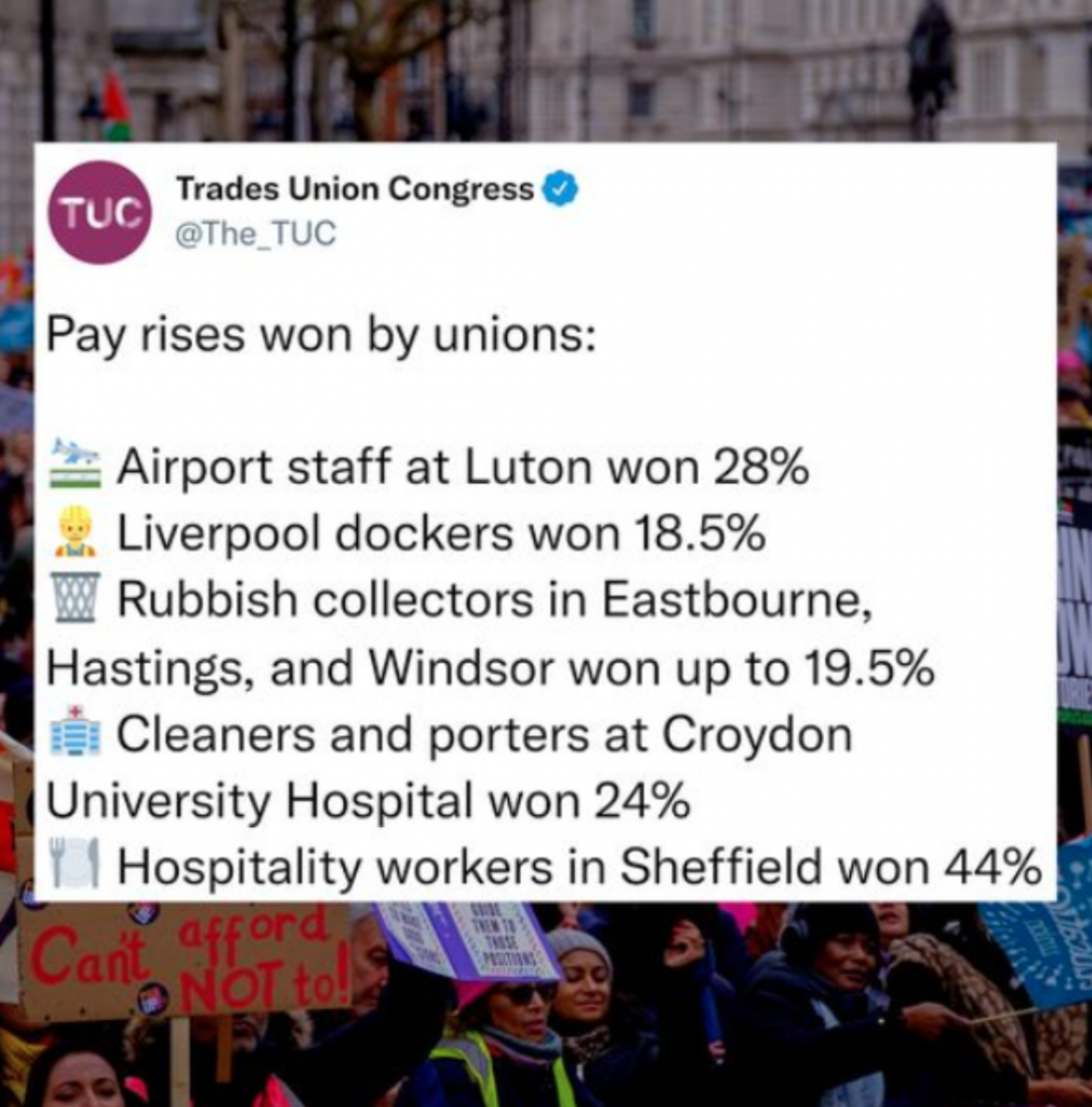 Verföllin eru þegar farin að skila árangri. Dæmi sem Trades Union Congress (TUC, ASÍ þeirra Breta) tekur eru samningar hjá verkafólki í hinum ýmsu geirum hafa skilað verkfallsfólki hækkanir á bilinu 18-44%!