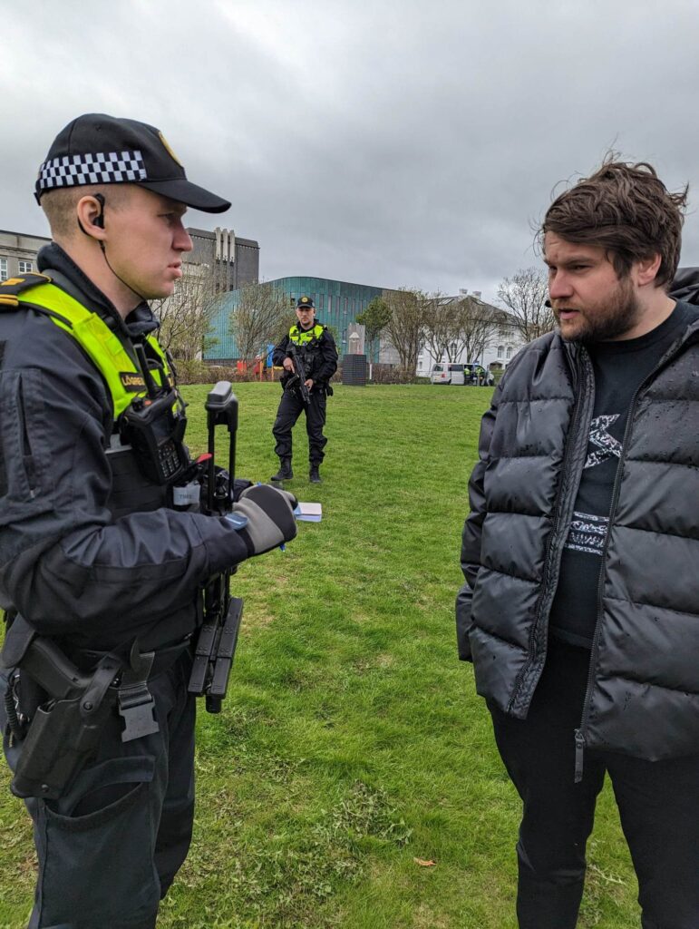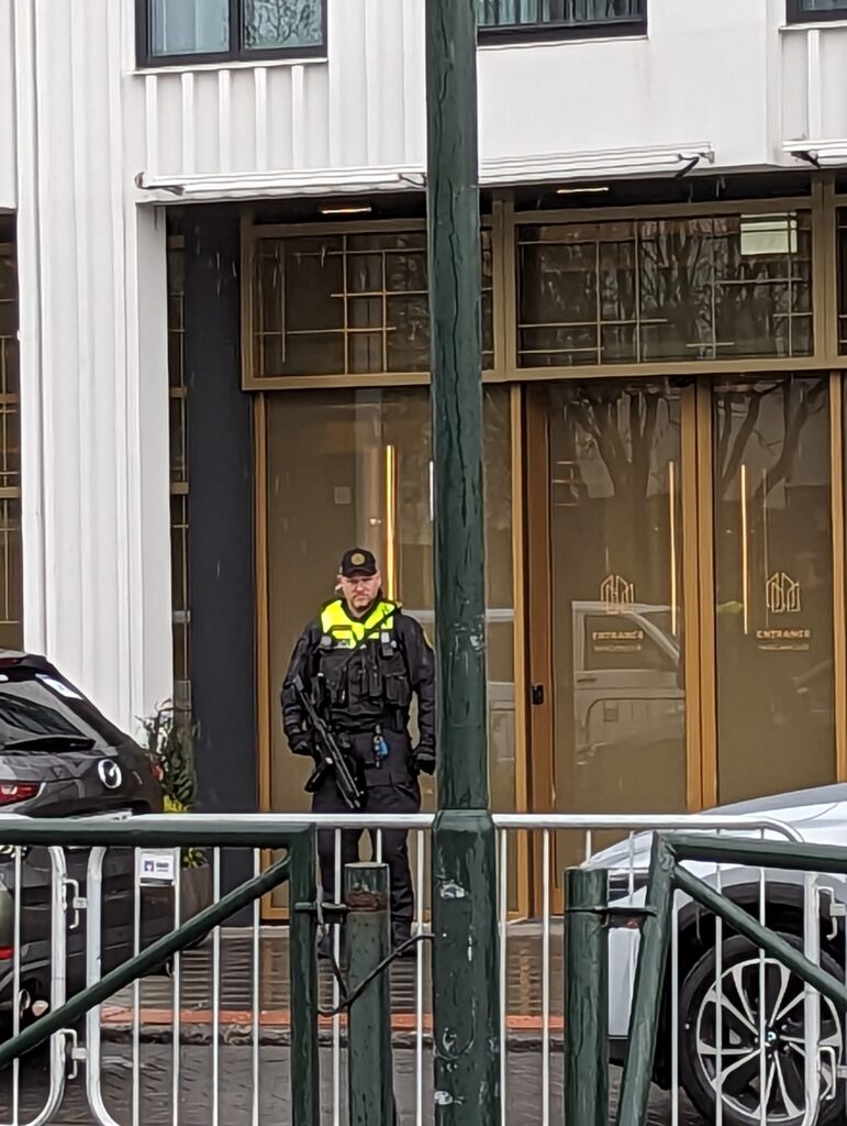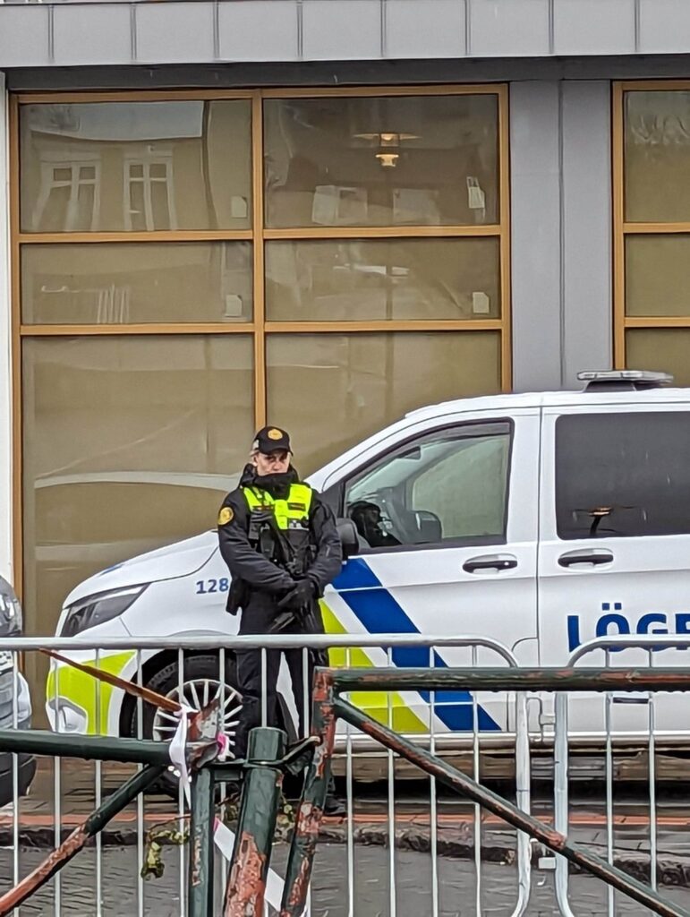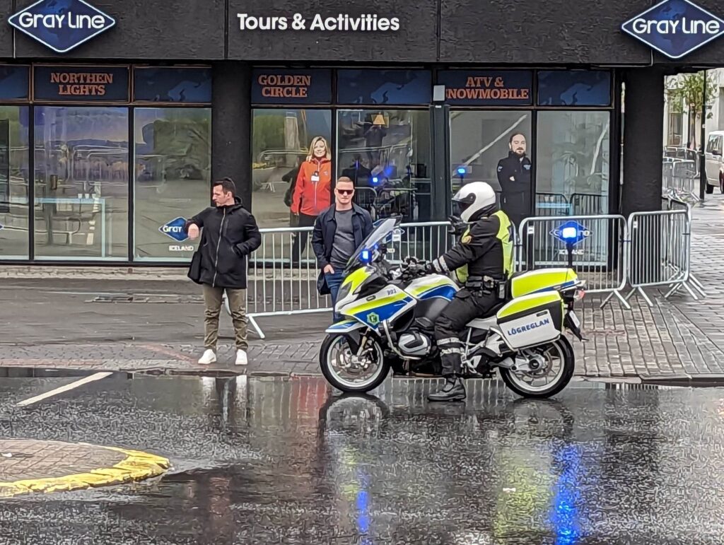 Fréttamenn tóku upp síma til að mynda bílana sem þutu annað slagið hjá og tóku eftir að við það spenntust lögreglumennirnir eilítið upp. Leyniskyttur höfðu, bersýnilega, komið sér fyrir ofan á húsi Seðlabankans og Hörpu. Vopnaðir lögreglumenn trygðu að vegurinn að Hörpu væri lokaður. Fréttamenn tóku nokkrar myndir frá Arnarhóli undir öruggu sjónmáli leyniskyttanna en innan skamms nálguðust tvær íslenskar löggur með vélbyssur og vildu fá kennitölur fréttamannanna.