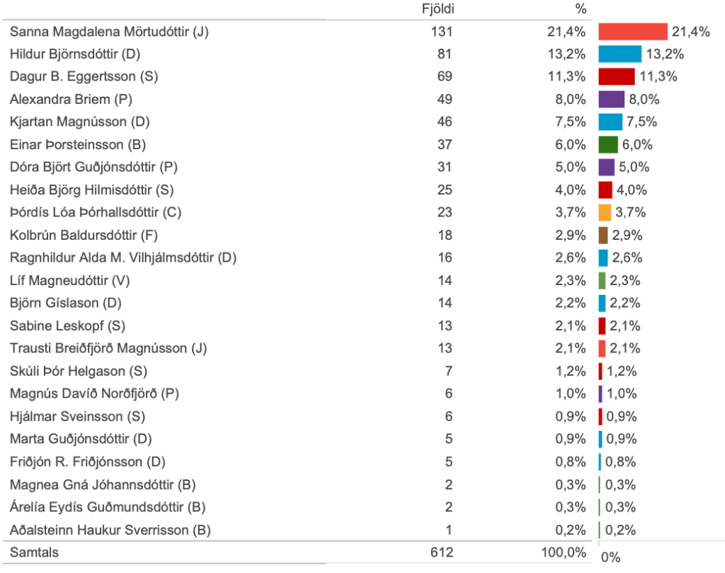 Oddvitar hinna flokkanna í meirihlutanum koma heldur ekki vel út: 8,0% nefndu Alexöndru Briem Pírata og 3,7% Þórdísi Lóu Þórhallsdóttur í Viðreisn. 2,9% nefndu Kolbrúnu Baldursdóttur í Flokki fólksins og 2,3% Líf Magneudóttur í Vg.