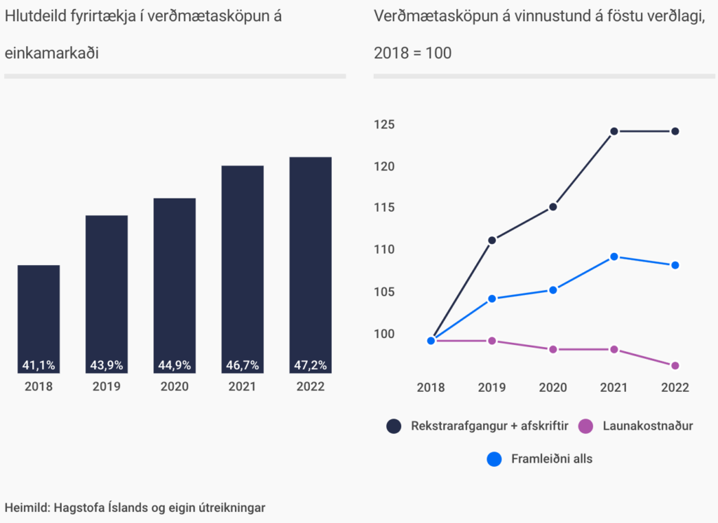 Hlutdeild fyrirtækjaeigenda í verðmætasköpun á einkamarkaði jókst milli áranna 2021 og 2022 meðan kaupmáttur almennings rýrnaði. Rekstrarafgangur jókst t.a.m. um 6% umfram verðbólgu í verslun milli áranna 2021 og 2022. Aukningin nam þá 22% að raunvirði í byggingaiðnaði og 12% að raunvirði í sjávarútvegi.