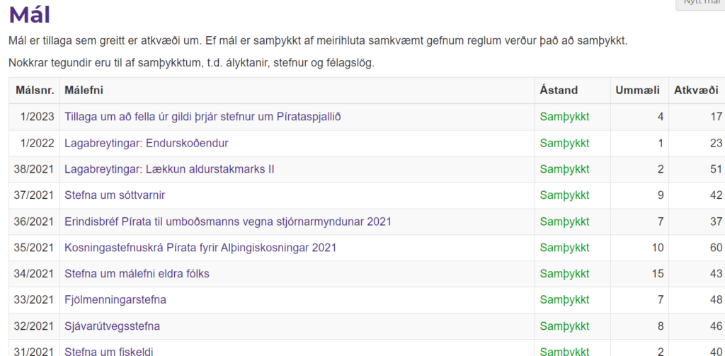 Að þessu sögðu þá var þó kosið í prófkjörum og nefndir á vefnum í fyrra, en líkt og fyrr segir þá fór ekkert fyrir málefnum. Það lýsir stöðunni vel að í nýjasta málinu sem var kosið um á vefnum, hvort flokkurinn ætti að slíta tengslum við Pírataspjallið, voru fjórir sem tjáðu sína afstöðu: Björn Leví Gunnarsson þingmaður flokksins, Alexandra Bríem borgarfulltrúi, Baldur Karl Magnússon starfsmaður þingflokksins og einn sem mætti telja með grasrót flokksins, Steinar Jónsson.