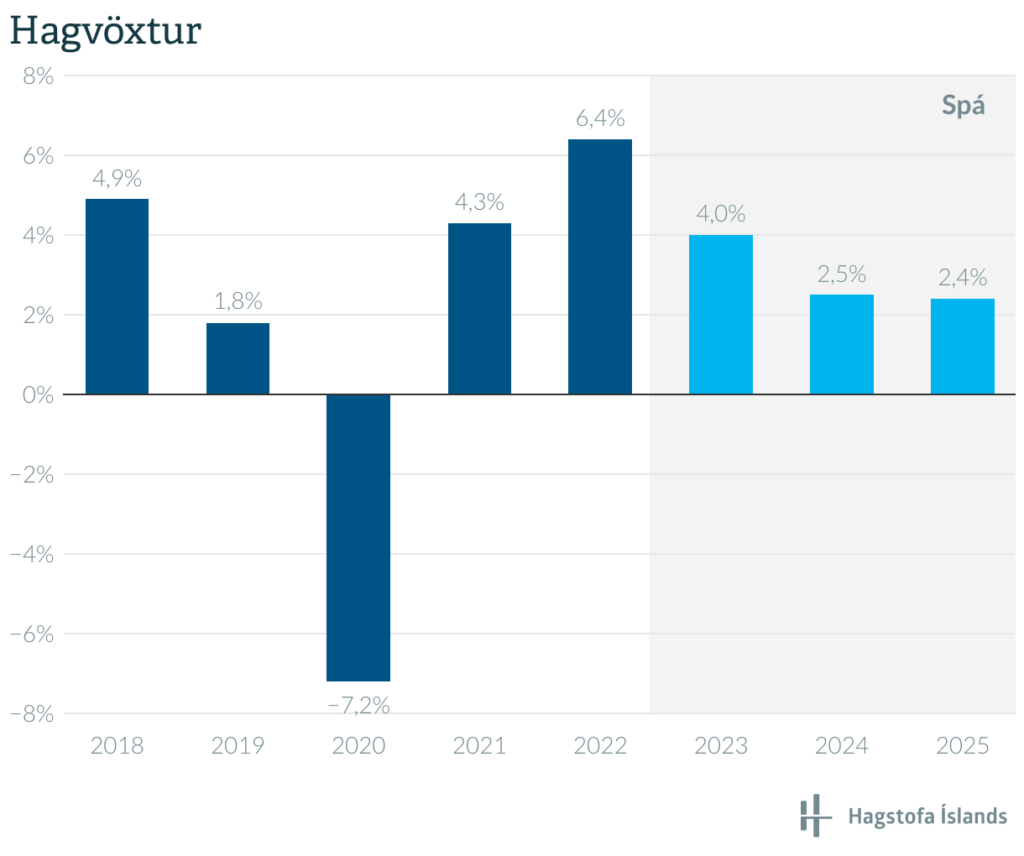 Reiknað er með að hagvöxtur verði 4% í ár og 2,5% árið 2024. Hagvöxtur síðasta árs var borinn uppi af innlendri eftirspurn en í ár er gert ráð fyrir auknu vægi utanríkisviðskipta. Á fyrsta ársfjórðungi jókst verg landsframleiðsla um 7% frá fyrra ári en gert er ráð fyrir að það hægi á aukningunni þegar líður á árið.