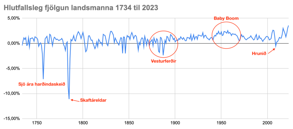 Hér má sjá hlutfallslega fjölgun landsmanna frá 1734. Talan fyrir 2023 er frá fyrsta ársfjórðungi.