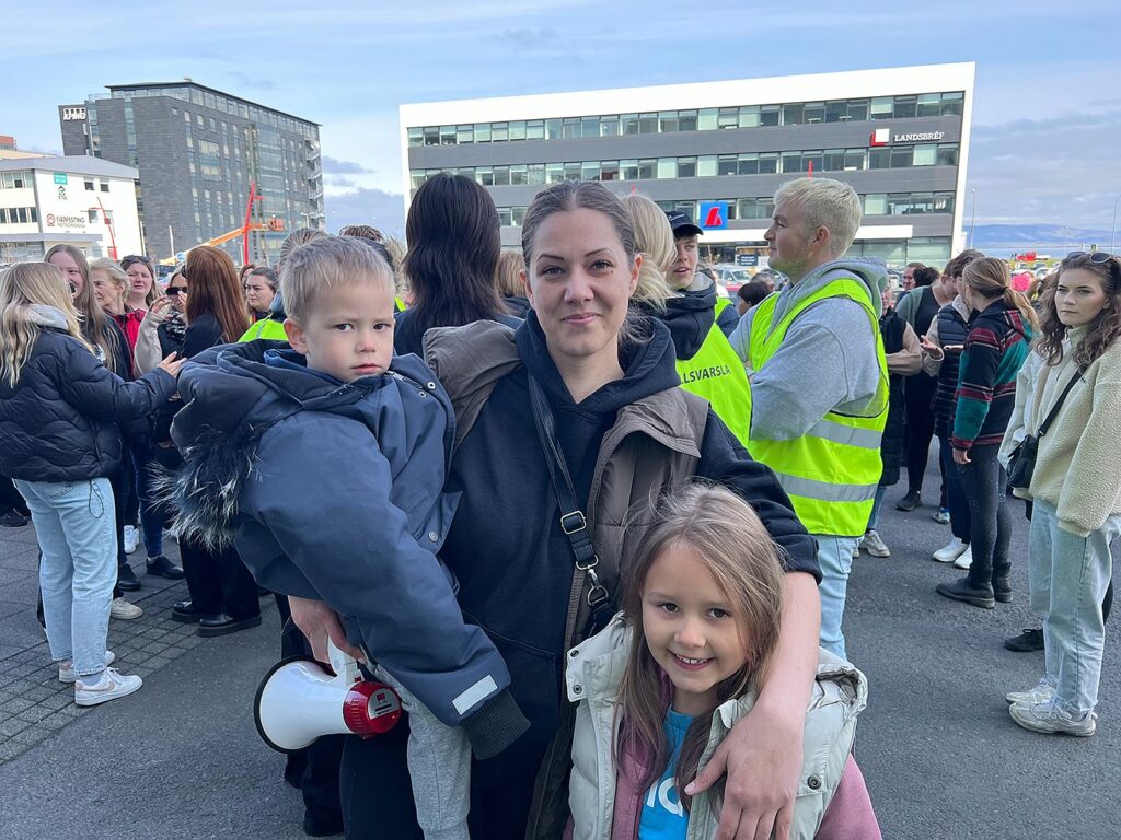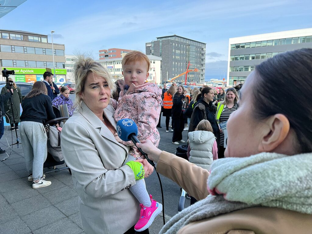 „Ég á líka eina þriggja vikna sem mun vonandi komast inná leikskola haustið 2024. Í störfum fólks á leikskólum er rútína yfir daginn þar sem þau njóta sín vel í rútinu og finna fyrir öryggi. Þar er þeim kennd félagsleg hæfni, læra að leika sér með vinum sínum o.s.frv. Þetta starfsfólk er ómissandi, í ómissandi störfum. Það er með gott og notalegt viðmót og hefur gaman af því að kenna börnum, sinnir daglegum athöfnum þeirra og dansa með þeim og syngja, skeina þeim, þvo hendur þeirra, gefa þeim að borða. Börn verða óörugg þegar það er mikil starfsmannavelta. Við vitum að starfsmannavelta orsakast að hluta til af óánægðu starfsfólki vegna launamisréttis og álagas í vinnu. Einnig ættu launin auðvitað að hækka í samræmi við verðbólgu. Semjið strax fyrir okkar framtíðar kynslóðir,“ sagði Erla Þórdís.