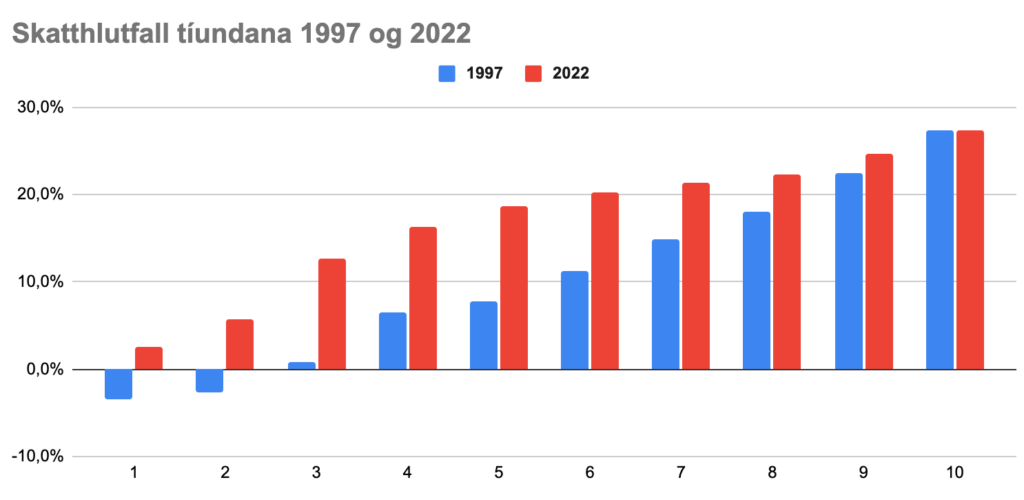 Þessi þróun sést ágætlega á þessu súluriti þar sem bláa súlan er skatthlutfall tíundanna 1997 en sú rauða hlutfallið í fyrra. Þetta er nettó-skattur, það er skattlagning að frádregnum barna- og vaxtabótum.