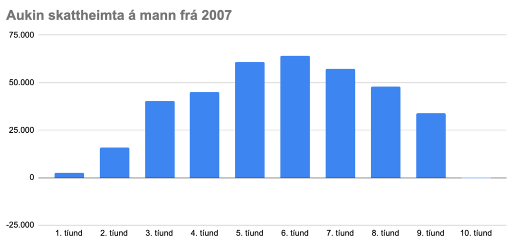 Þarna sést að aukin skattheimta jafngildir rúmum 64 þúsund krónum á mánuði fyrir hvern einstakling í 6. tekjutíund. Þetta fer svo lækkandi eftir því sem tekjurnar eru minni, en hægt þar til hækkunin verður lítil í krónum talið hjá tveimur neðstu tíundunum þótt hún mælist hlutfallslega mikil. Þar hefur átt sér stað eðlisbreyting, skatturinn tekur í dag fé af fólki sem er með lægri tekjur en duga til framfærslu. Það var ekki gert á árum áður, þótti ósiðlegt. En nýfrjálshyggjan er breyttur siður, kannski helst af öllu.